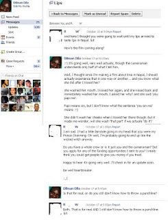 So I wrote this line in my Facebook status – I thought Nepali lips would taste different, but all lips taste the same! — and a lot of people sent me various messages, some congratulating, others not so nice messages, and she sent this in my in-box. Here is the conversation.
