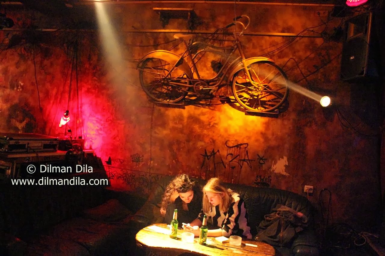 Inside the club, the atmosphere again was nothing like what I had seen before. I can’t describe it. Take a look at the pictures. It’s worth a thousand words. They had a bicycle pinned onto the wall, and there were faces of monsters all over the place. The lights, and the (was it wall paper or just paint) gave the place a feel of a sci-fi movie set. In fact, it reminded me of one of my favorite fantasy films, The Mirror Mask. We sat down for a drink, and were surprised to realize that there was a projector beaming a film onto the wall. Cartoons. No sound. We had to listen to the electronic music. I thought that very weird. Why would they show cartoons in a bar?
